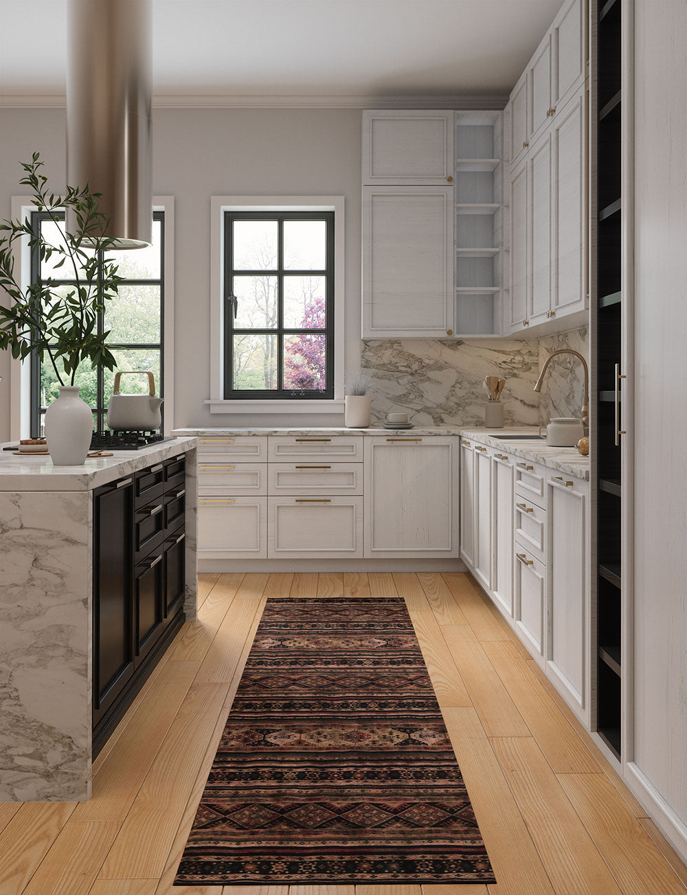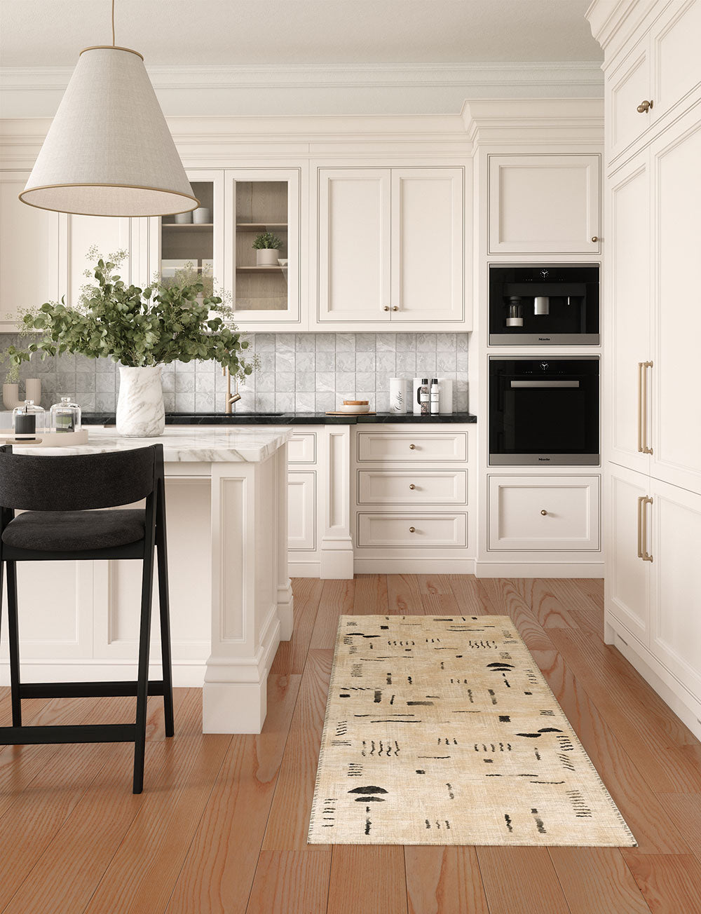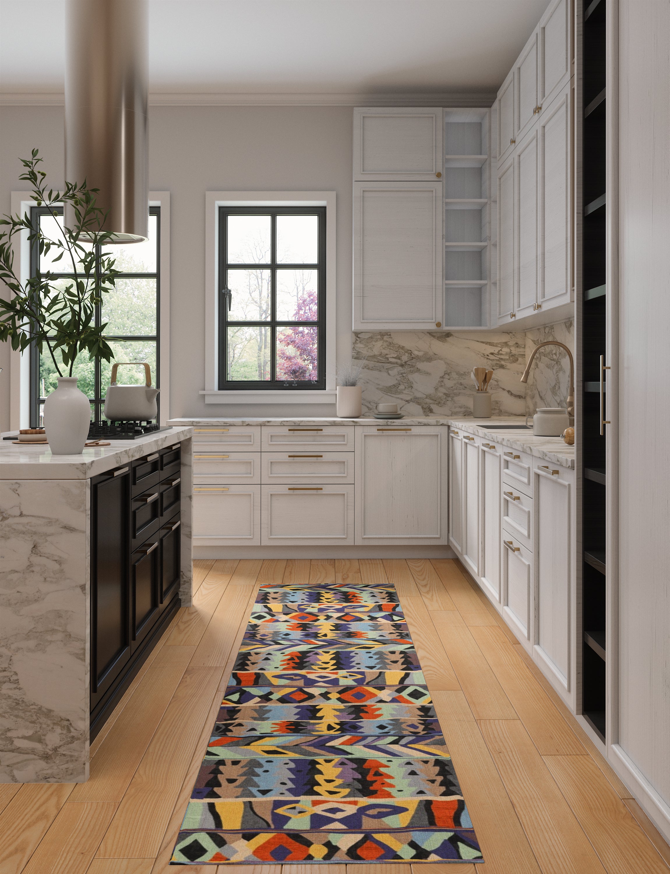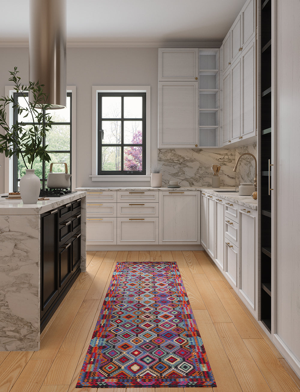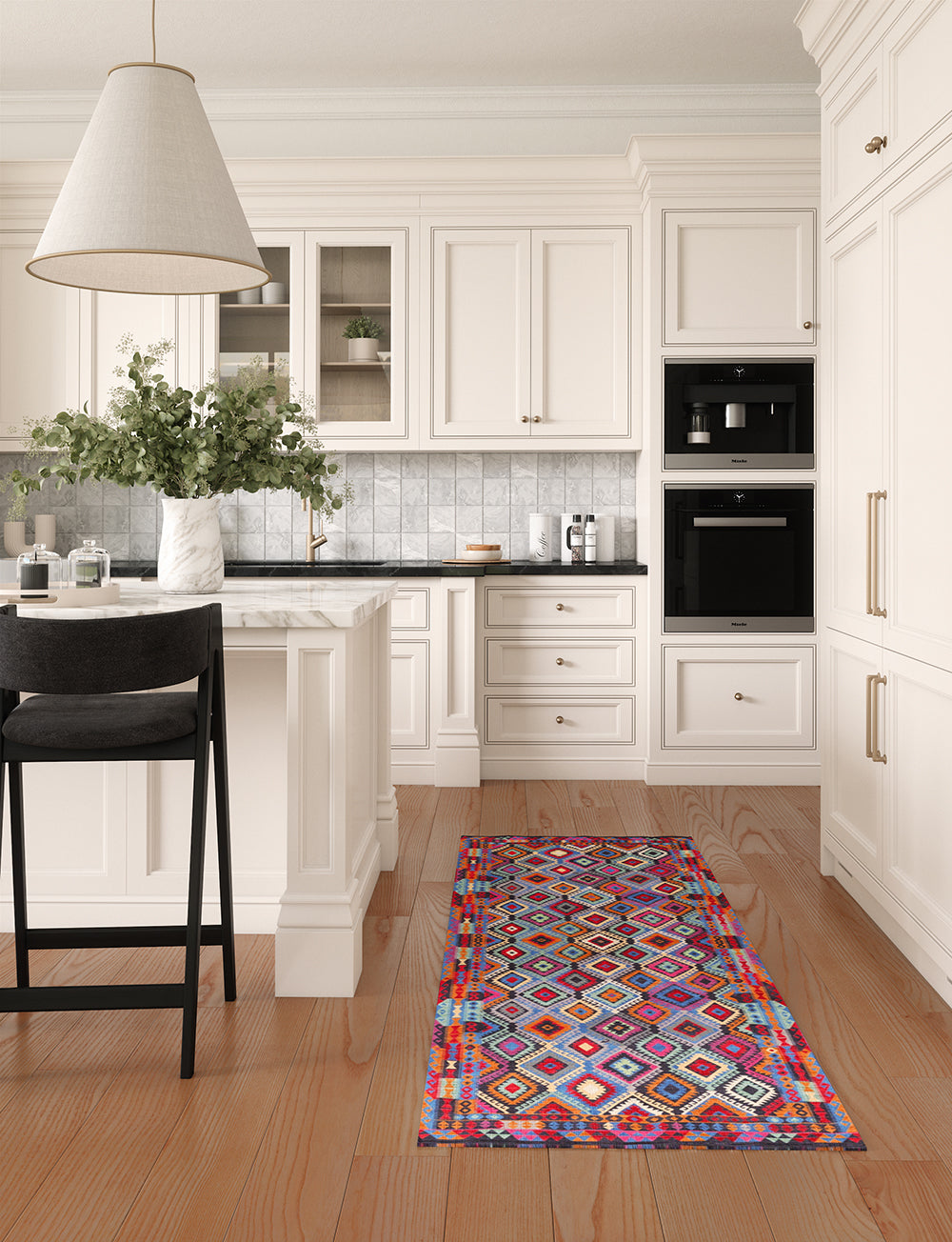 Kitchen: Enhance your medium or large kitchen by placing the rug in front of the sink or on either side of the kitchen island. You can also use it beneath smaller tables in your kitchen dining area for a delightful touch.