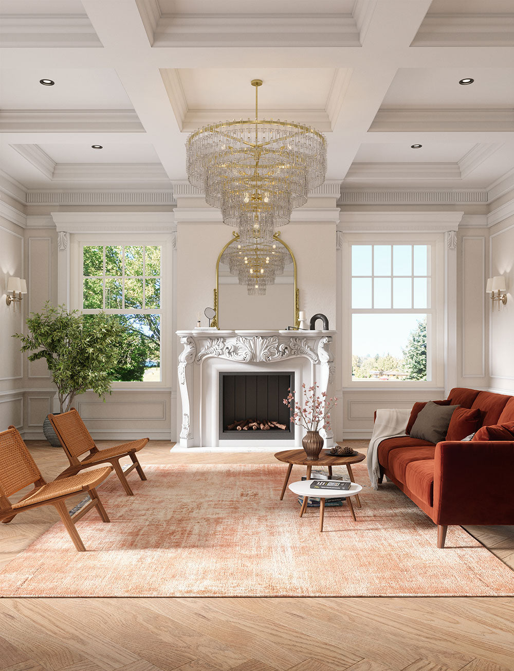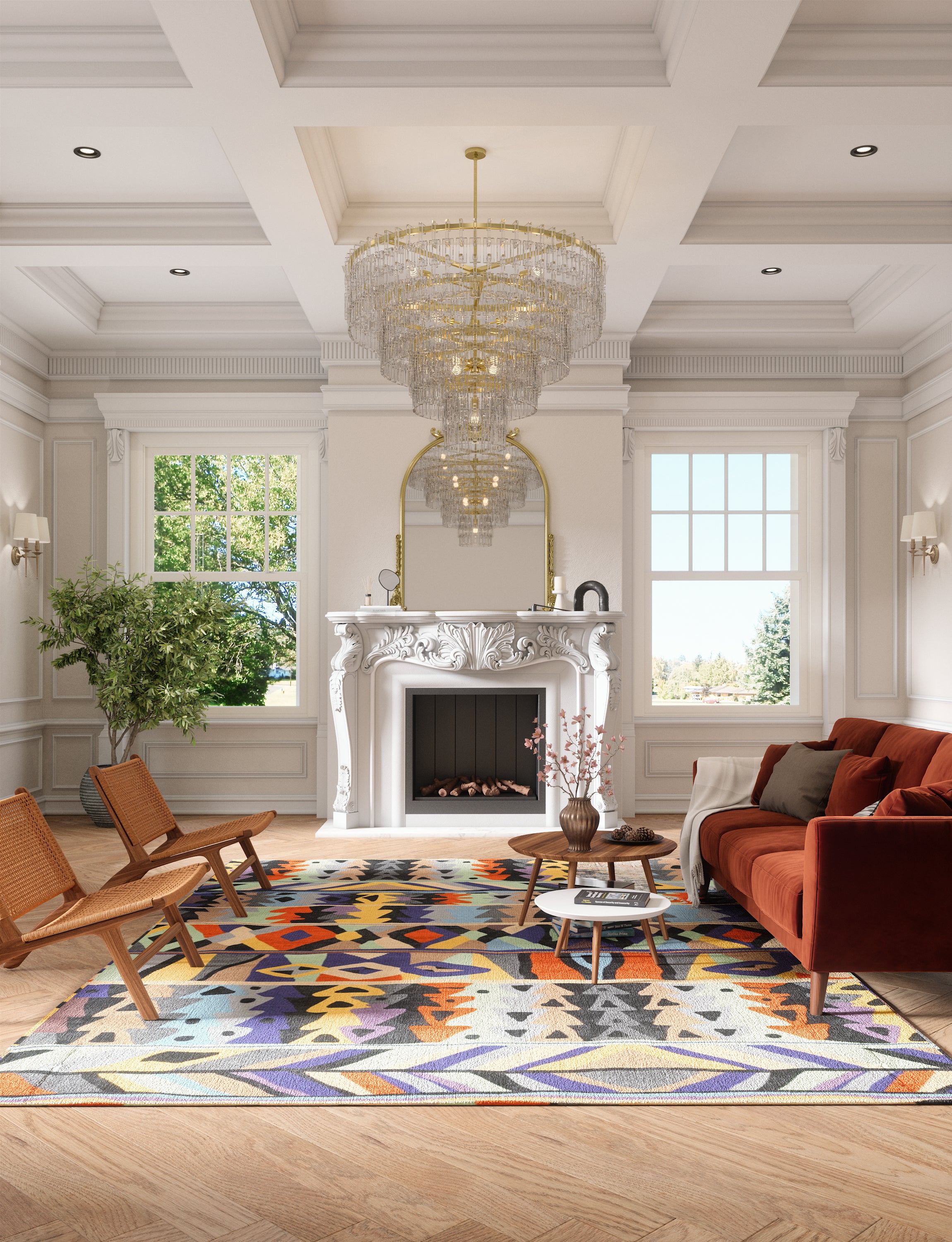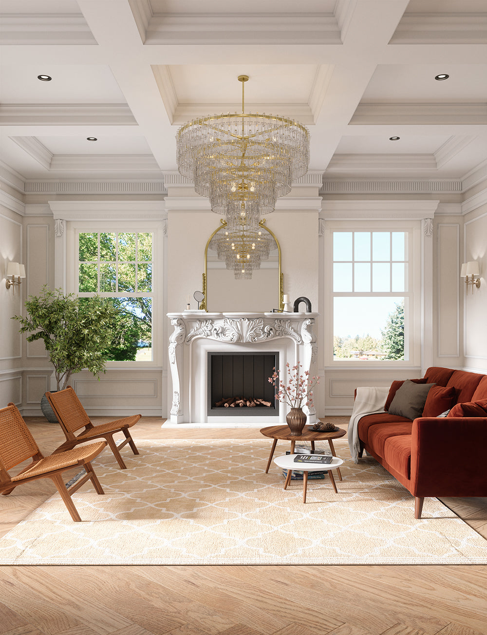 Living Room: Transform your small living room with a 5'x7' rug that covers most of the floor space. In medium-sized living rooms, place it under the coffee table, allowing the front legs of the couch to rest off the rug. For larger living rooms, use the rug to define cozy sections like a reading nook or a sitting area by the fireplace.