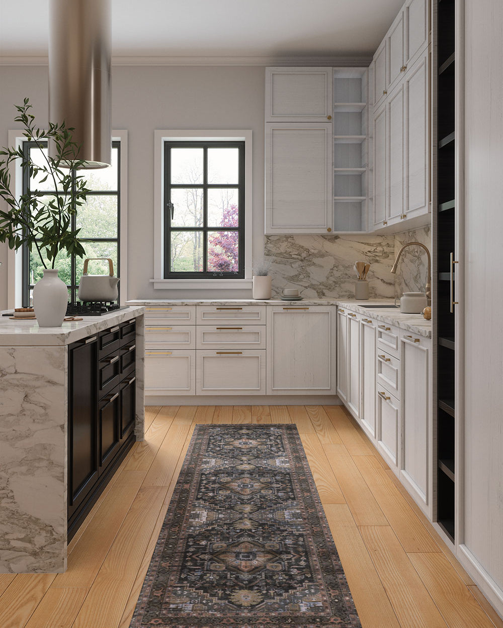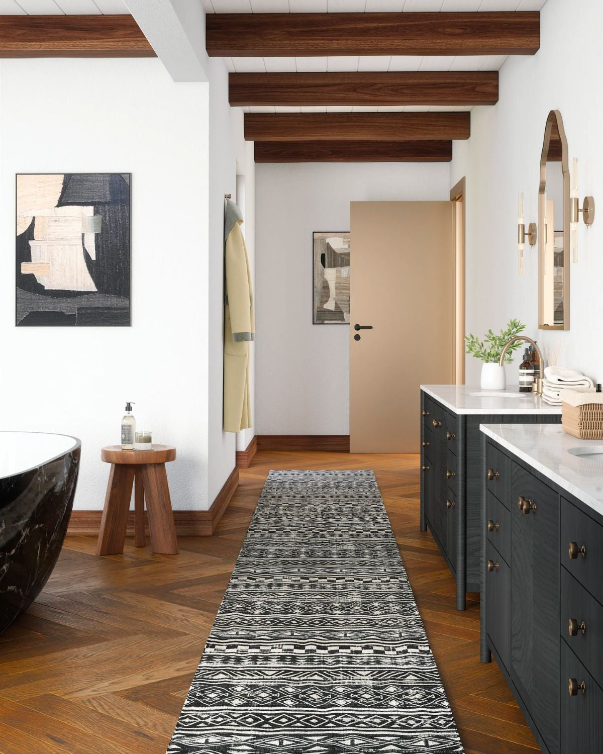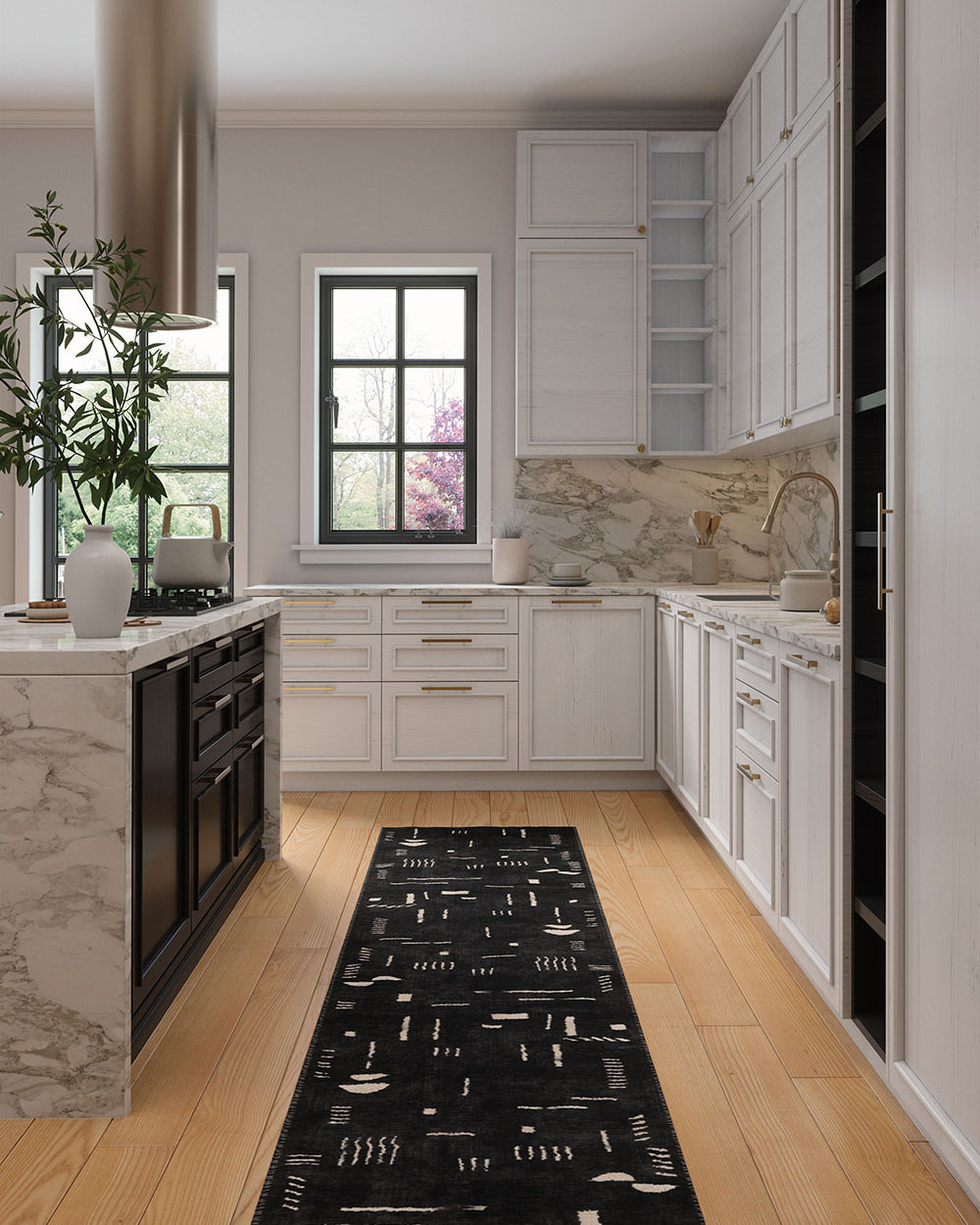Black stands out as a versatile and fashionable choice when it comes to selecting furnishings for your space, and black area rugs and runners are no exception. With a black rug, you have the freedom to experiment with various prints, colors, and furniture arrangements to suit your desired theme or ambiance. The practicality of black rugs also shines through, as they can draw attention to specific areas, accentuate decor or furniture pieces, and cleverly conceal flaws and stains in high-traffic zones. No matter which room you choose to adorn with a black rug, you can be certain that it will infuse depth and style into the space.