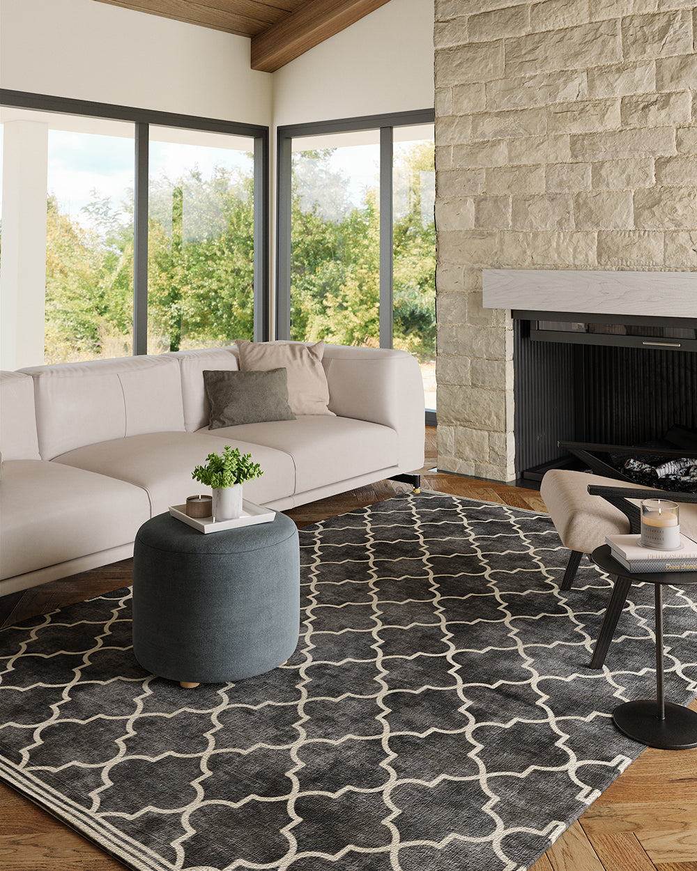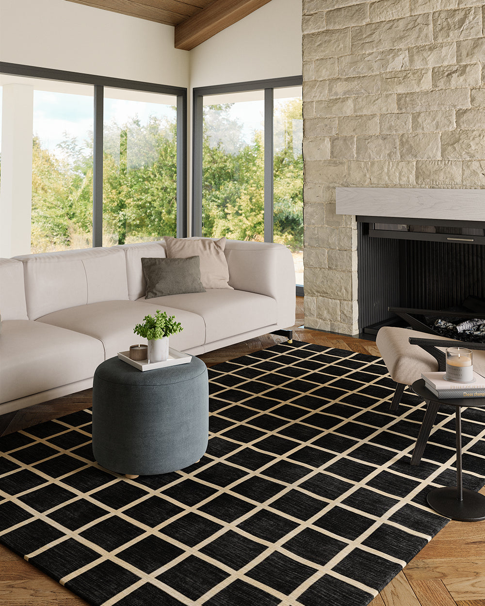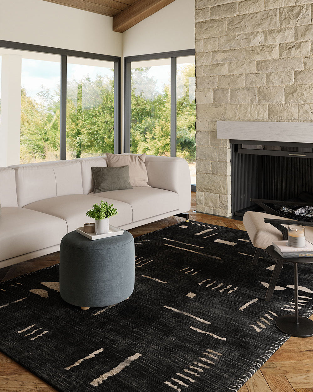 In the Living Room: Inject boldness into your living room with a black rug that serves as a centerpiece. Achieve a cohesive look by incorporating other black accents or create striking contrasts with furniture in brown, tan, or white. For an eye-catching effect, pair your black living room rug with vibrant pops of color.