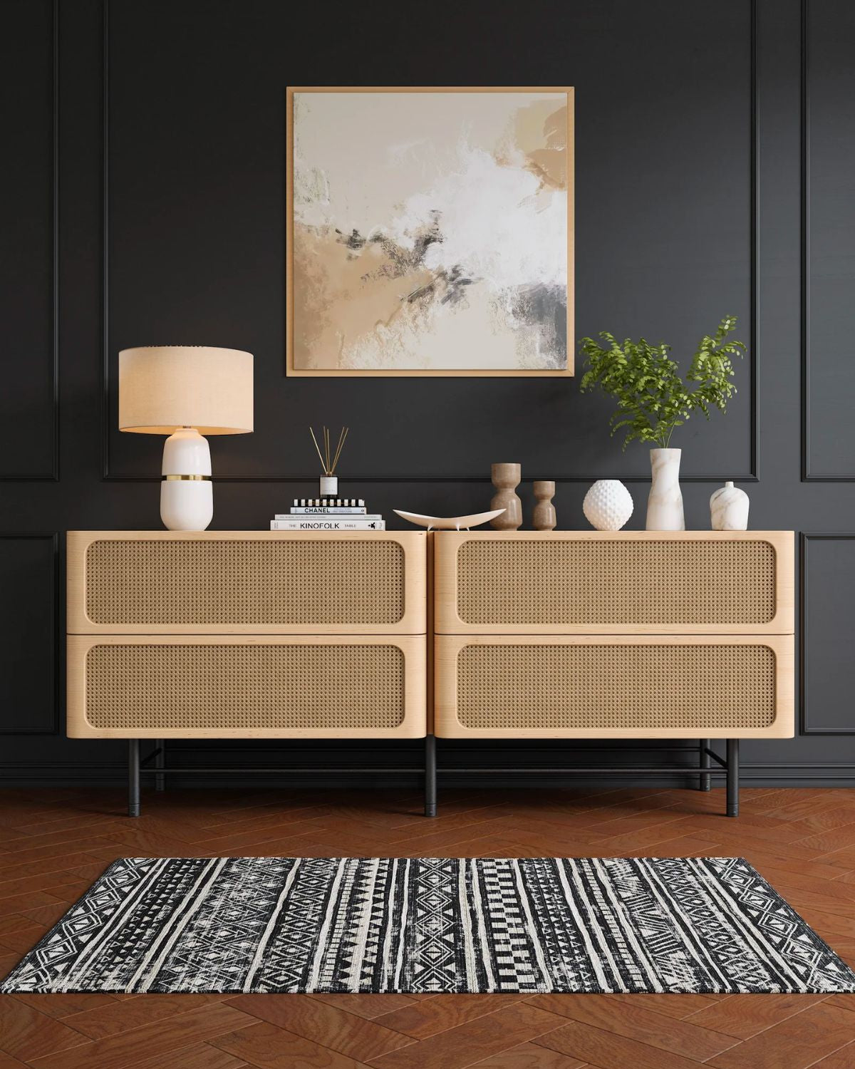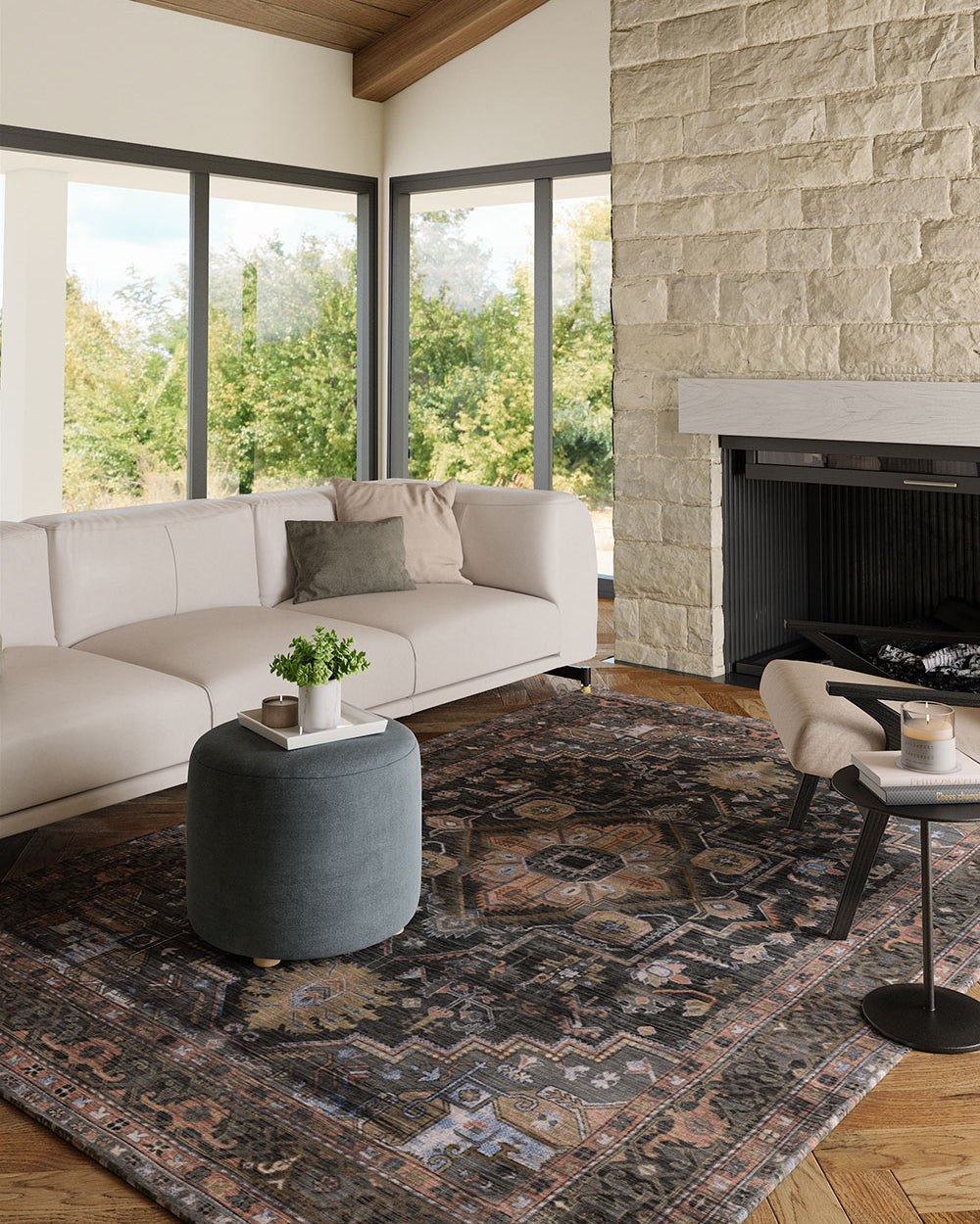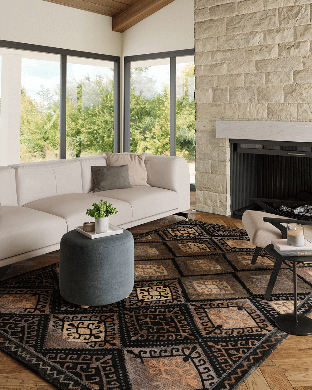 In the Living Room: Inject boldness into your living room with a black rug that serves as a centerpiece. Achieve a cohesive look by incorporating other black accents or create striking contrasts with furniture in brown, tan, or white. For an eye-catching effect, pair your black living room rug with vibrant pops of color.