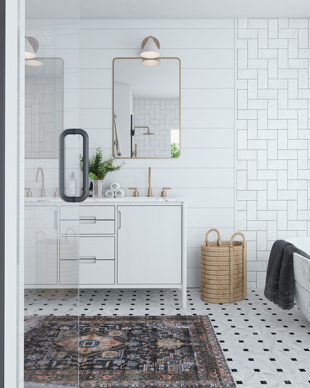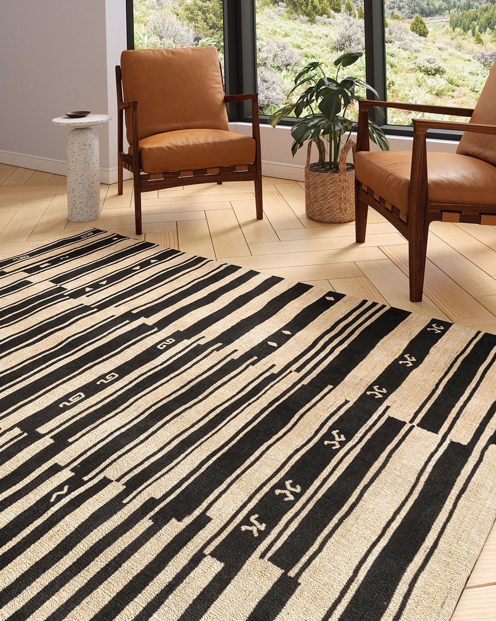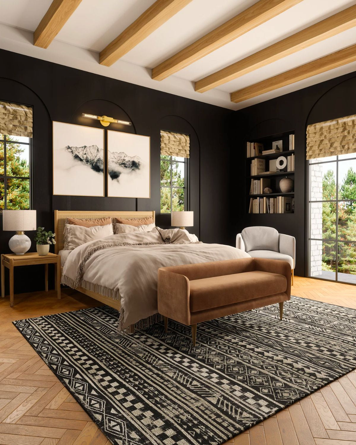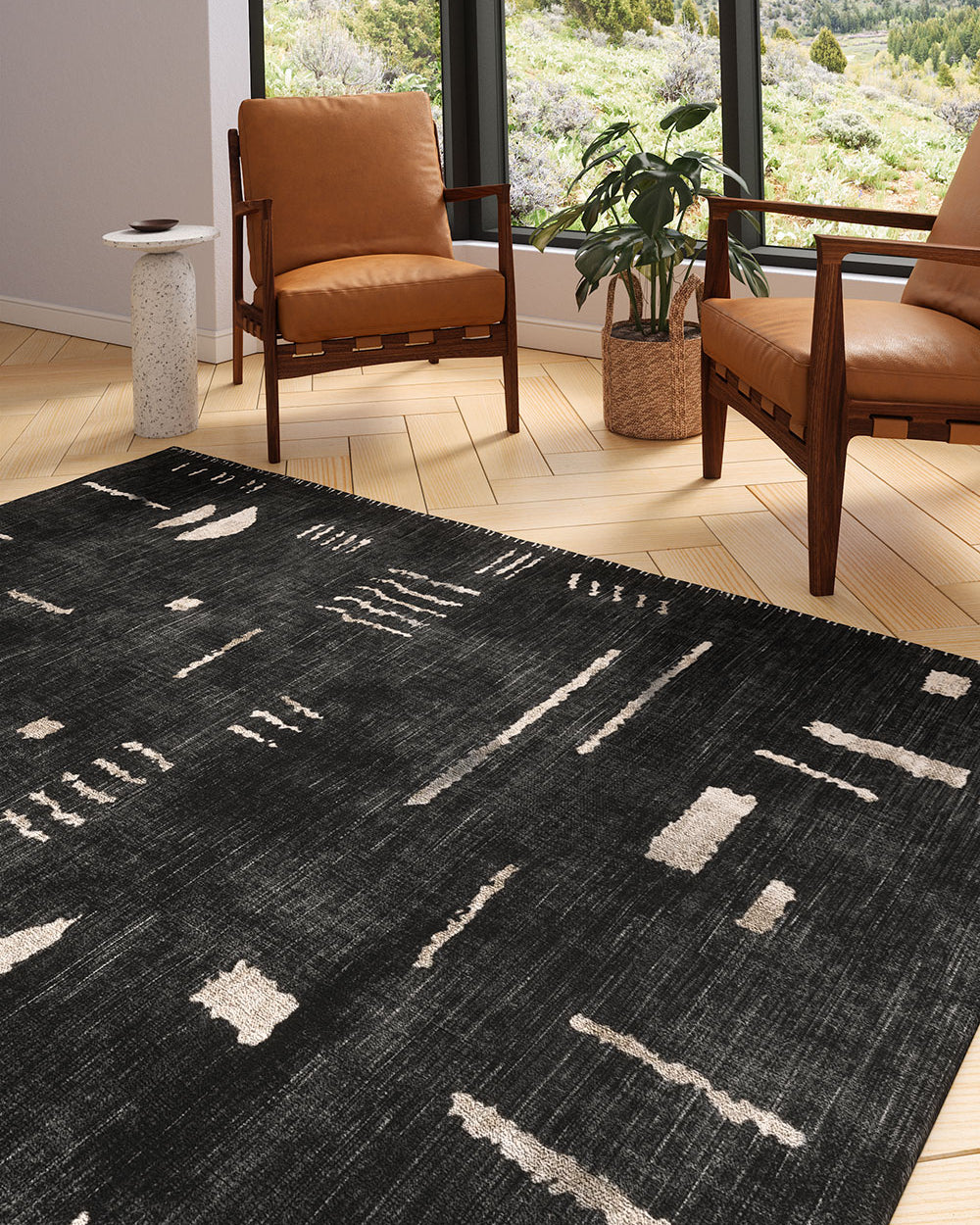 In the Bedroom: Foster a relaxed and effortless vibe in your bedroom with a black rustic rug. For a more modern touch, opt for a large black rug adorned with geometric patterns placed beneath your bed.