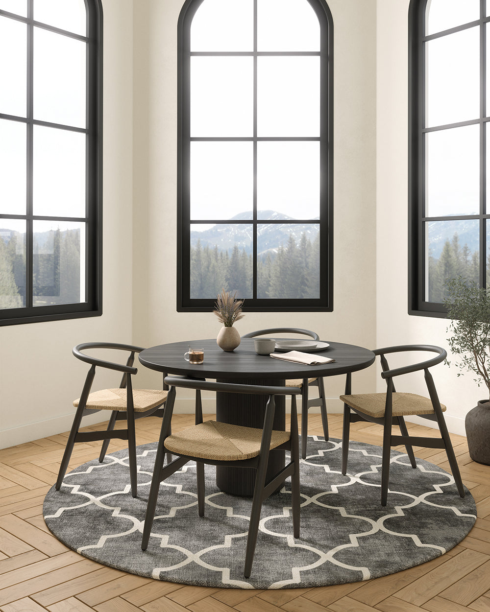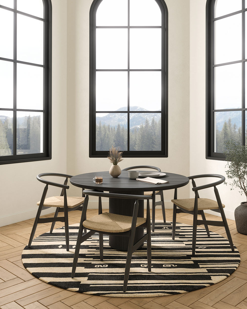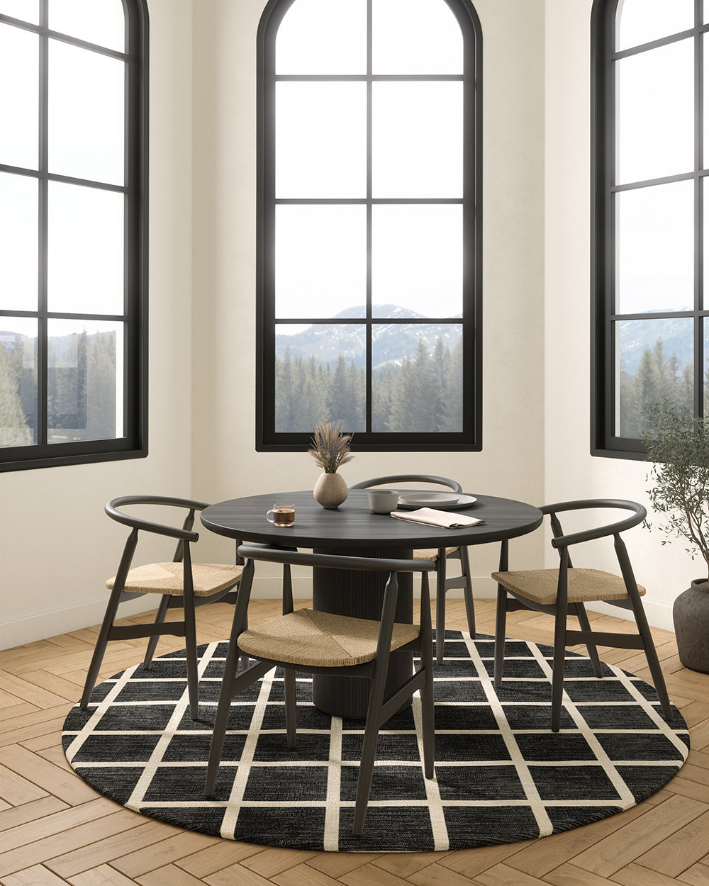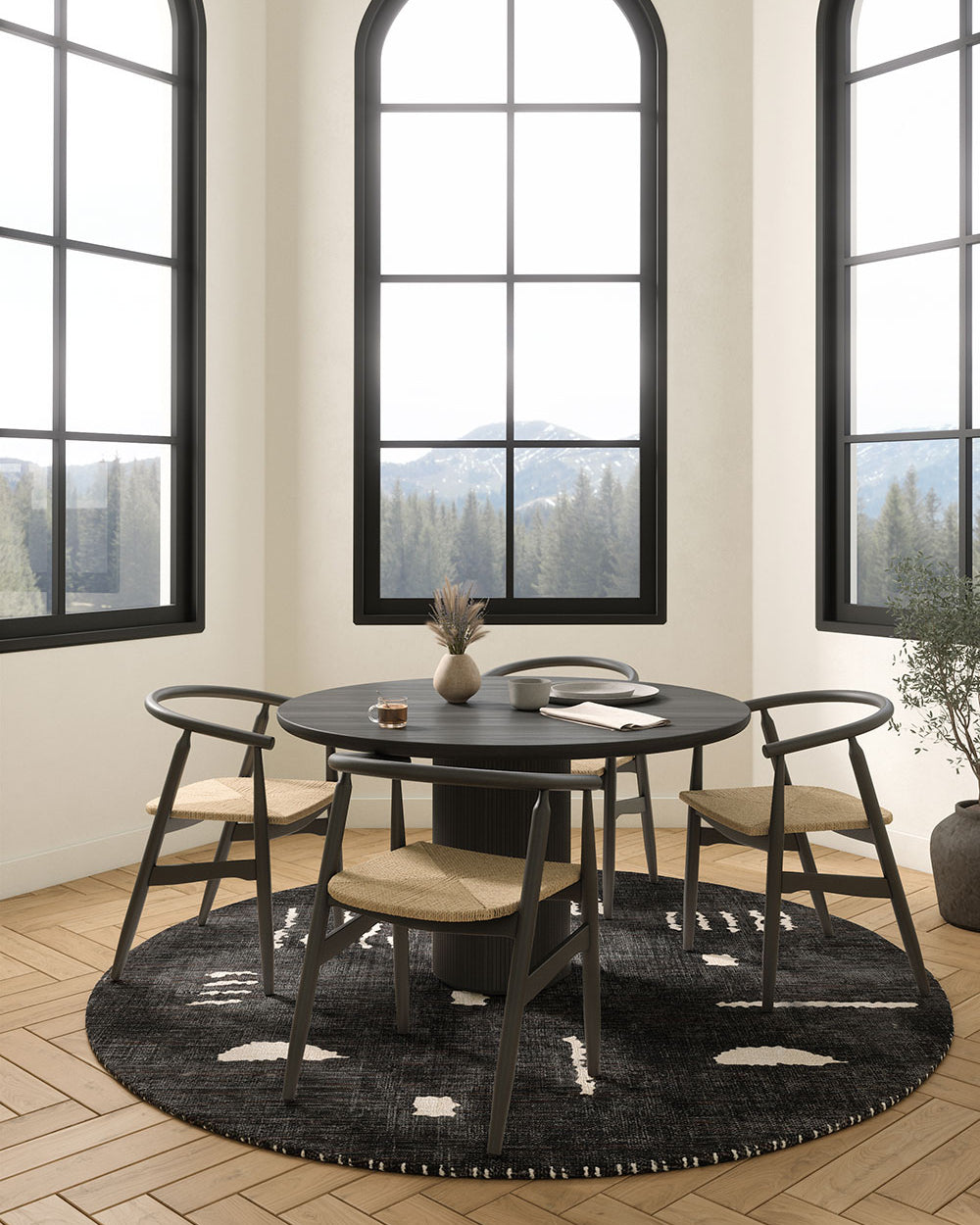 In the Dining Room: Elevate your dining room by adding a black area rug beneath the dining table. Versatile for all occasions, a black dining room rug imparts a sense of sophistication and uniqueness to the space.