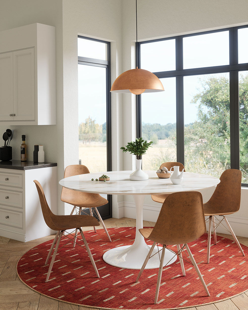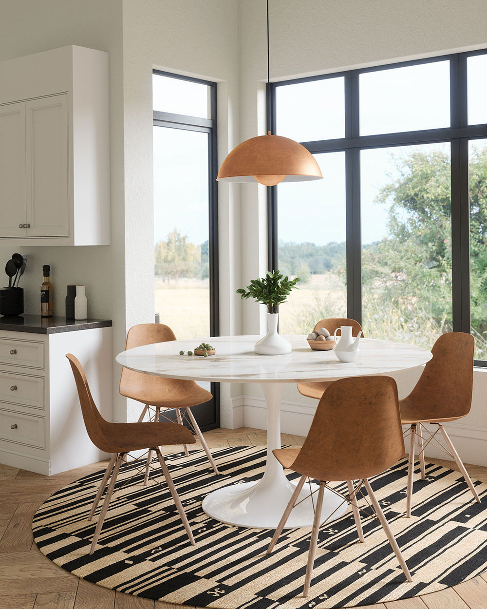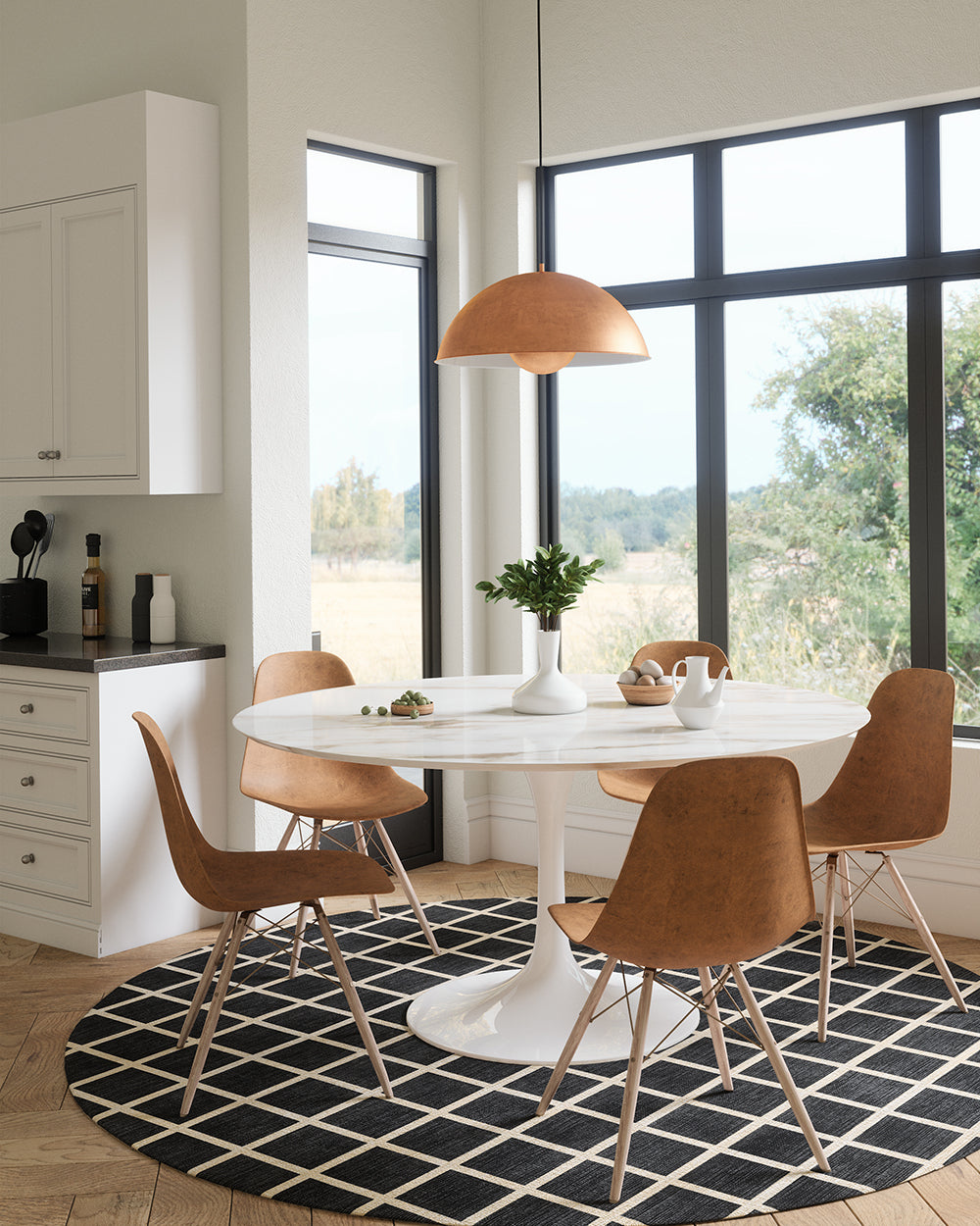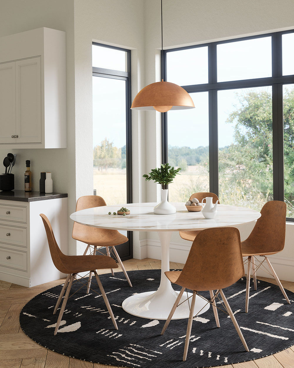 In the Dining Room: Elevate your dining room by adding a black area rug beneath the dining table. Versatile for all occasions, a black dining room rug imparts a sense of sophistication and uniqueness to the space.