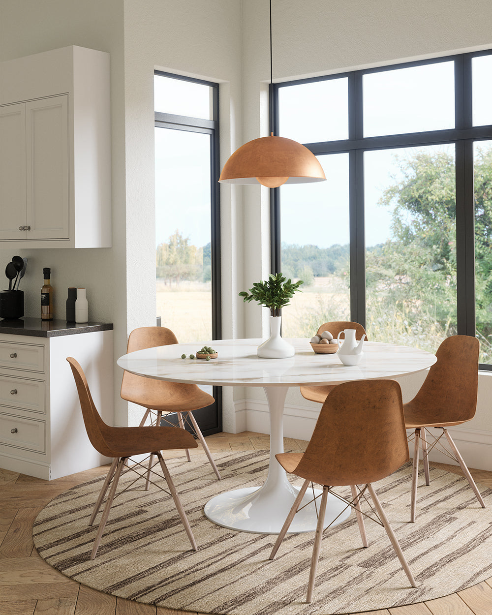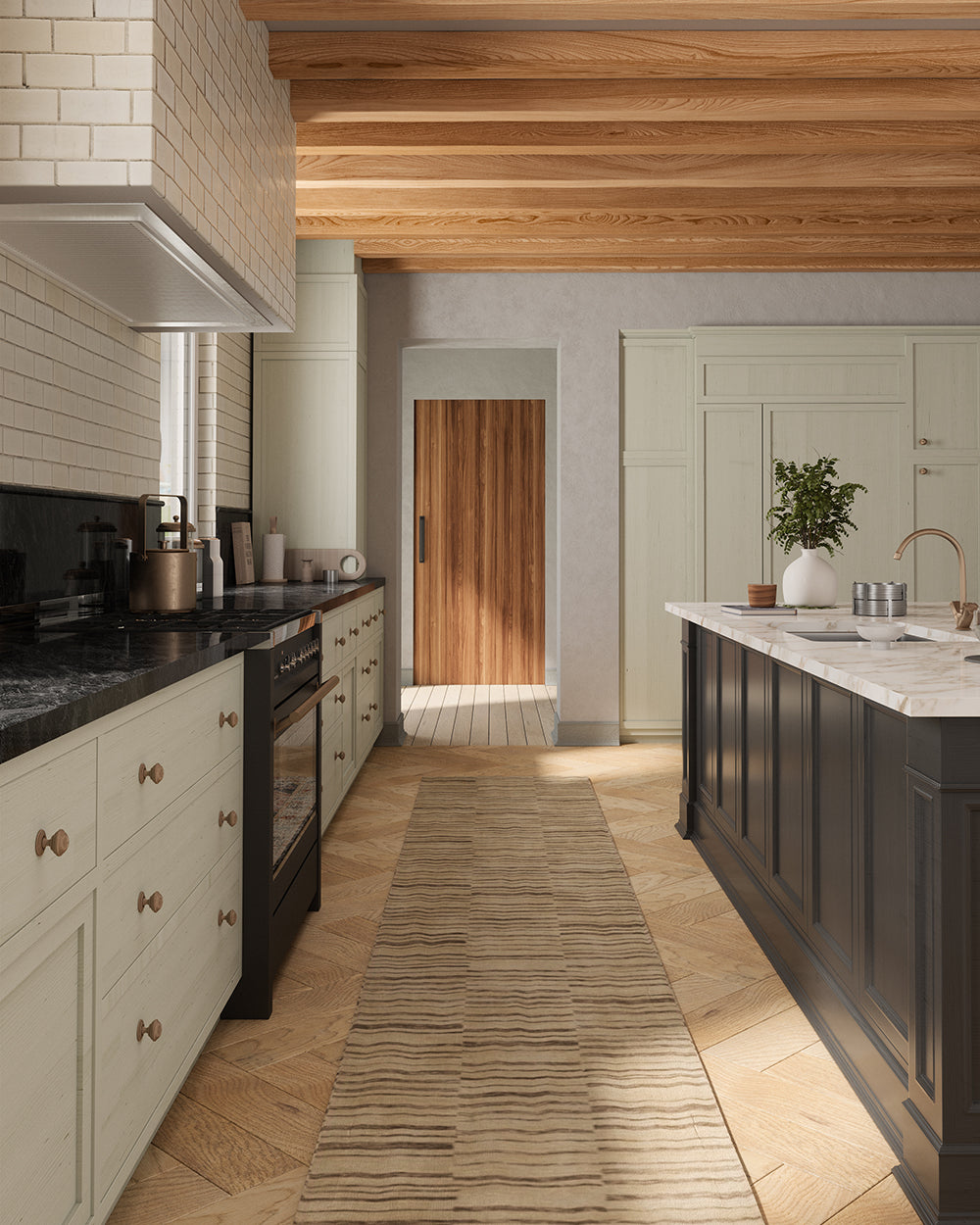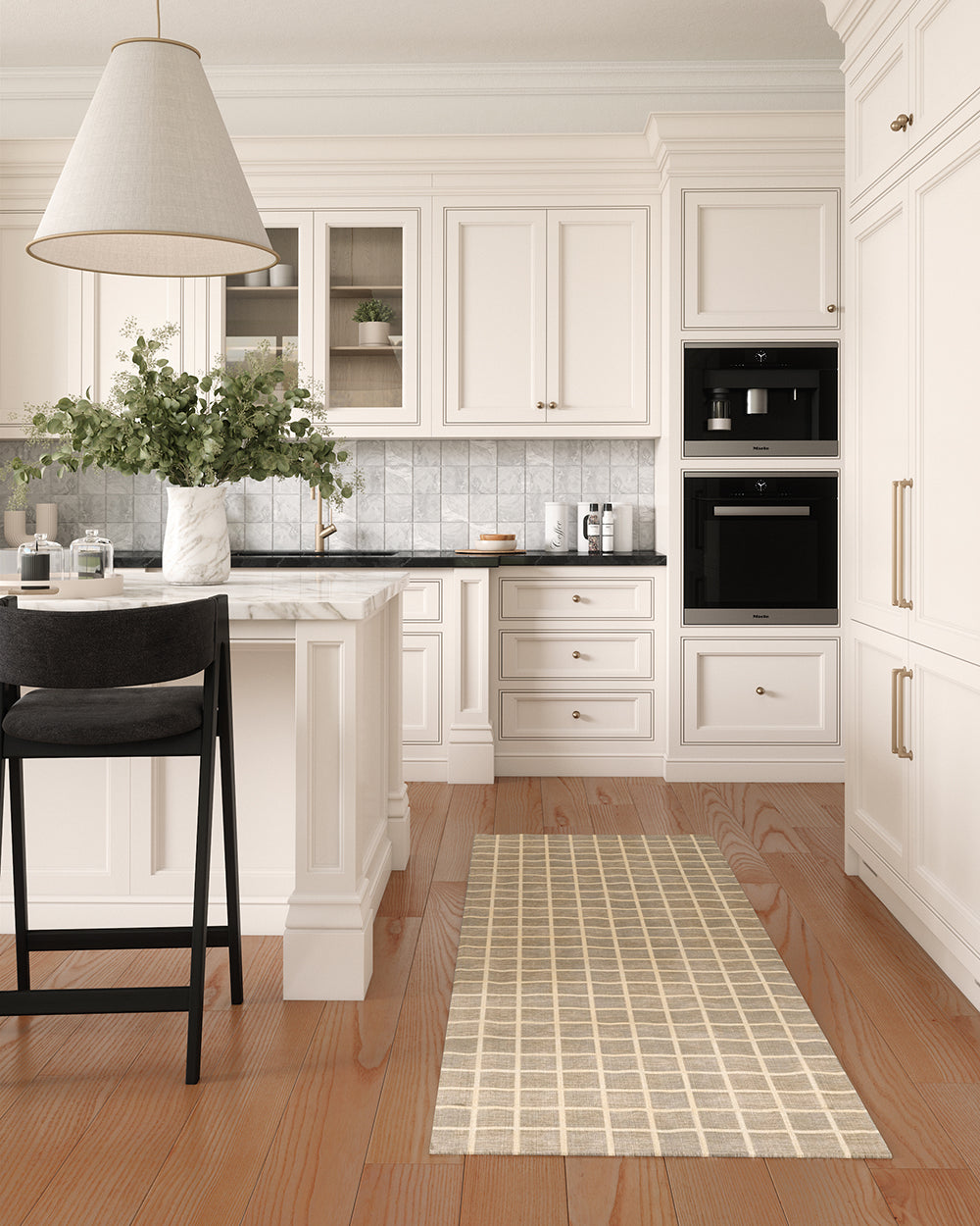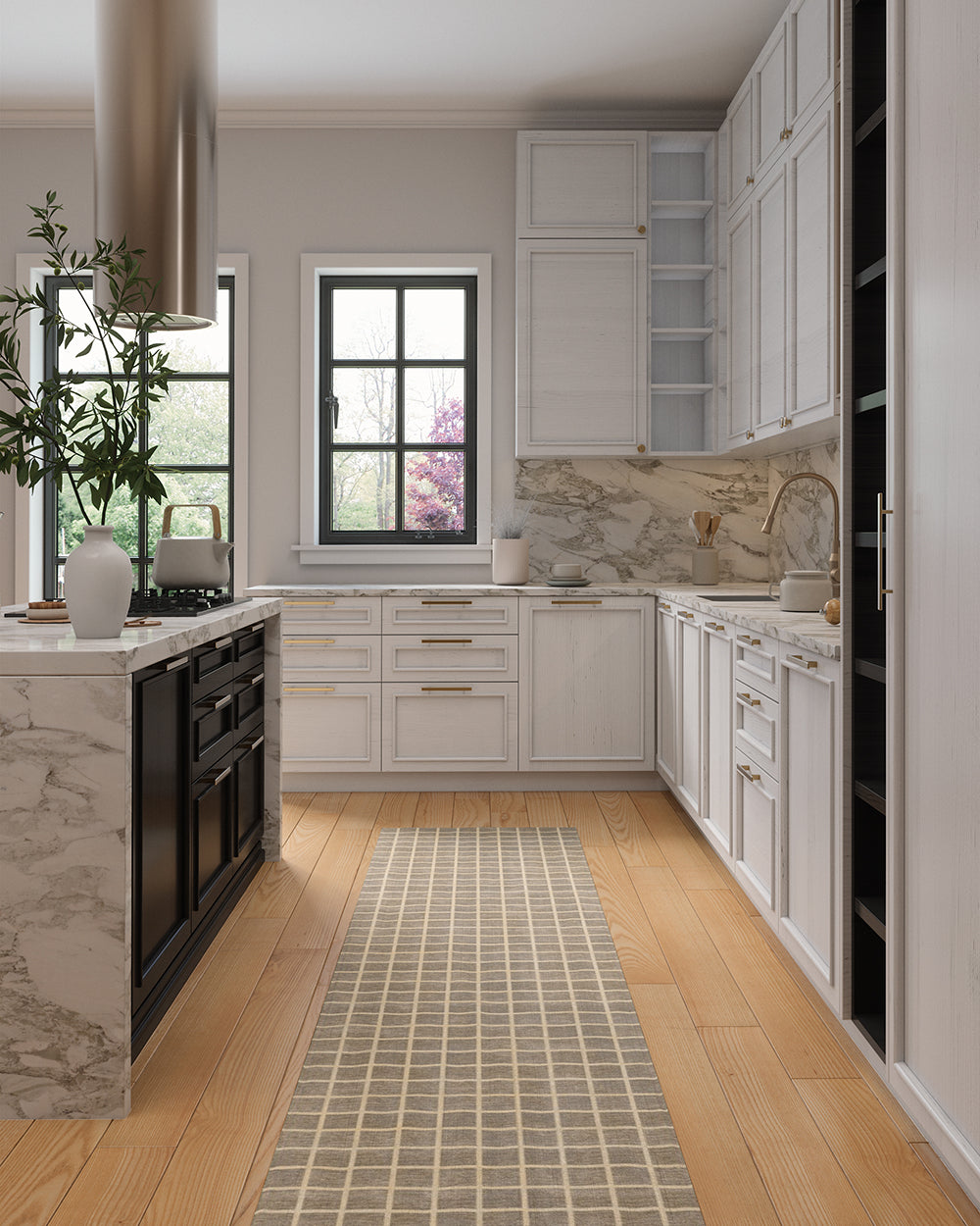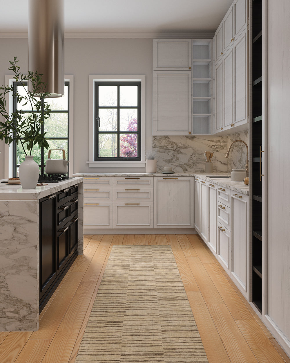 Kitchen: Achieve a subtle and refined look in your kitchen with a natural or neutral area rug or runner. For kitchens with lighter colors, a darker natural rug provides an appealing contrast. In darker-toned kitchens, opt for a light-toned rug like beige to brighten up the space.