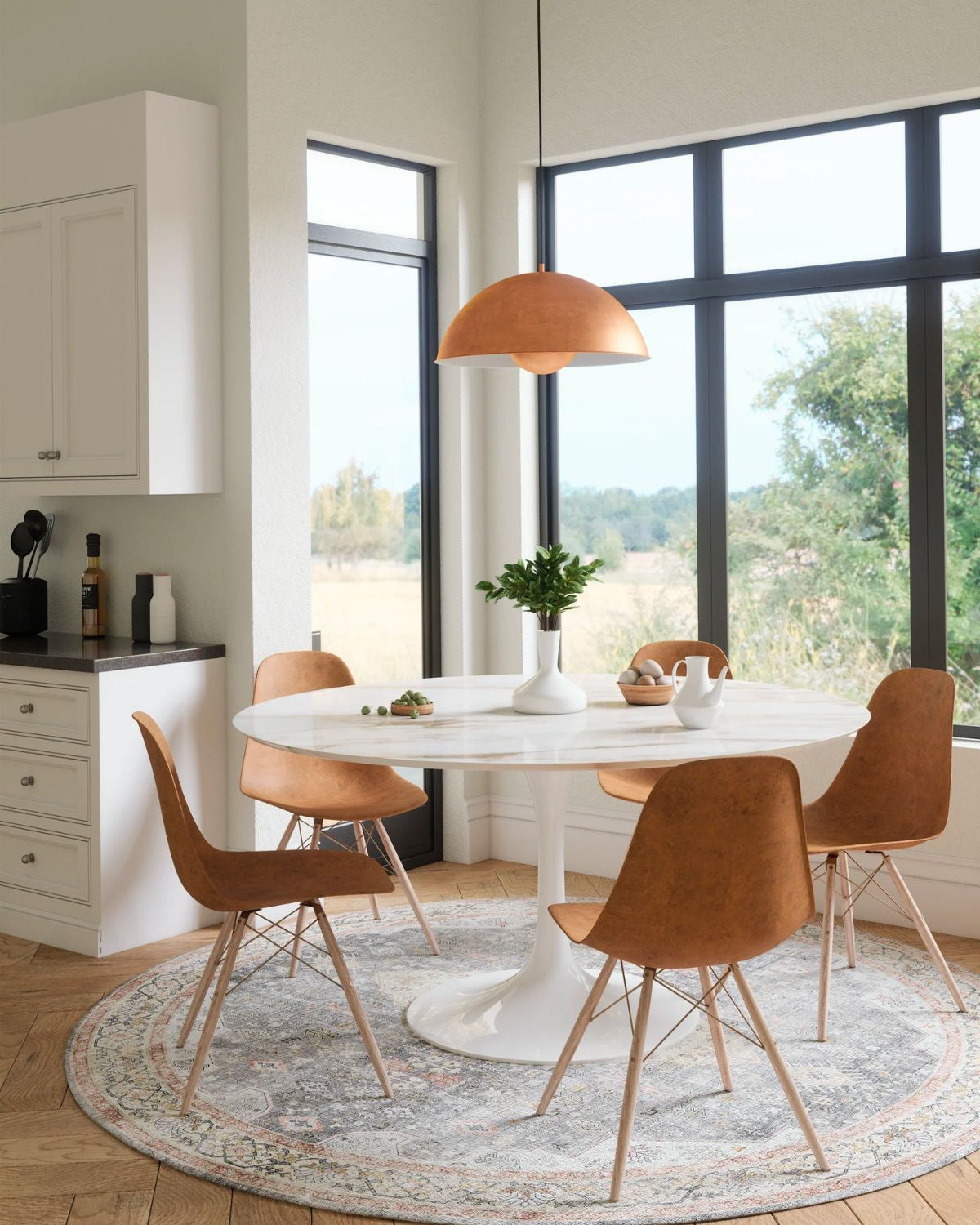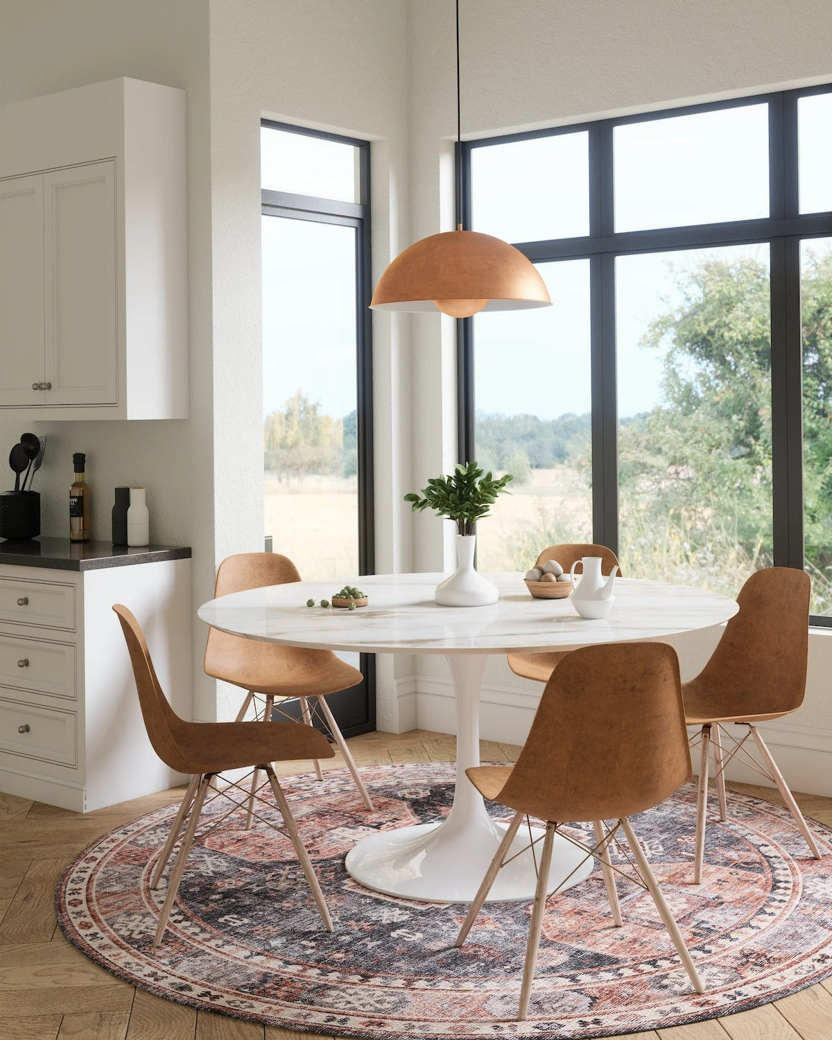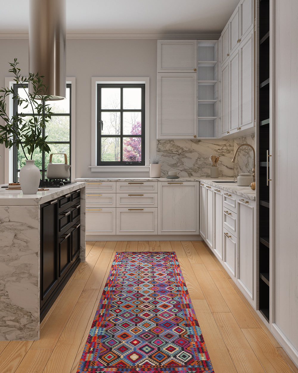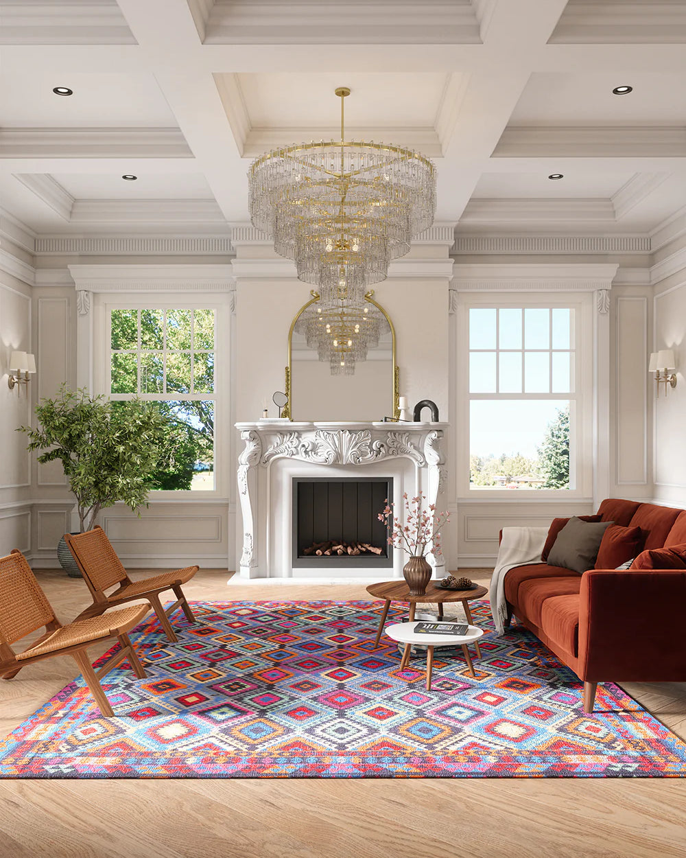 Living Room: Infuse your living room with an uplifting ambiance by incorporating lilac rugs or plum rugs. These vibrant options effortlessly elevate the mood of the room. Pair them with warm brown leather and brass accents for a luxurious, opulent feel. For a touch of edginess, consider contrasting accent shades like yellow, green, or teal, which add an unexpected flair to the space.