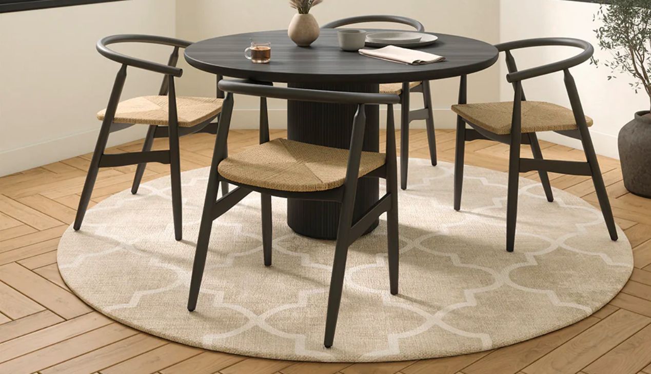 For a table intended for four people, the optimal choice is an 8' round rug, while alternatively, you can position the table and chairs in the middle of a 6'x9' rug, creating a floating effect.
