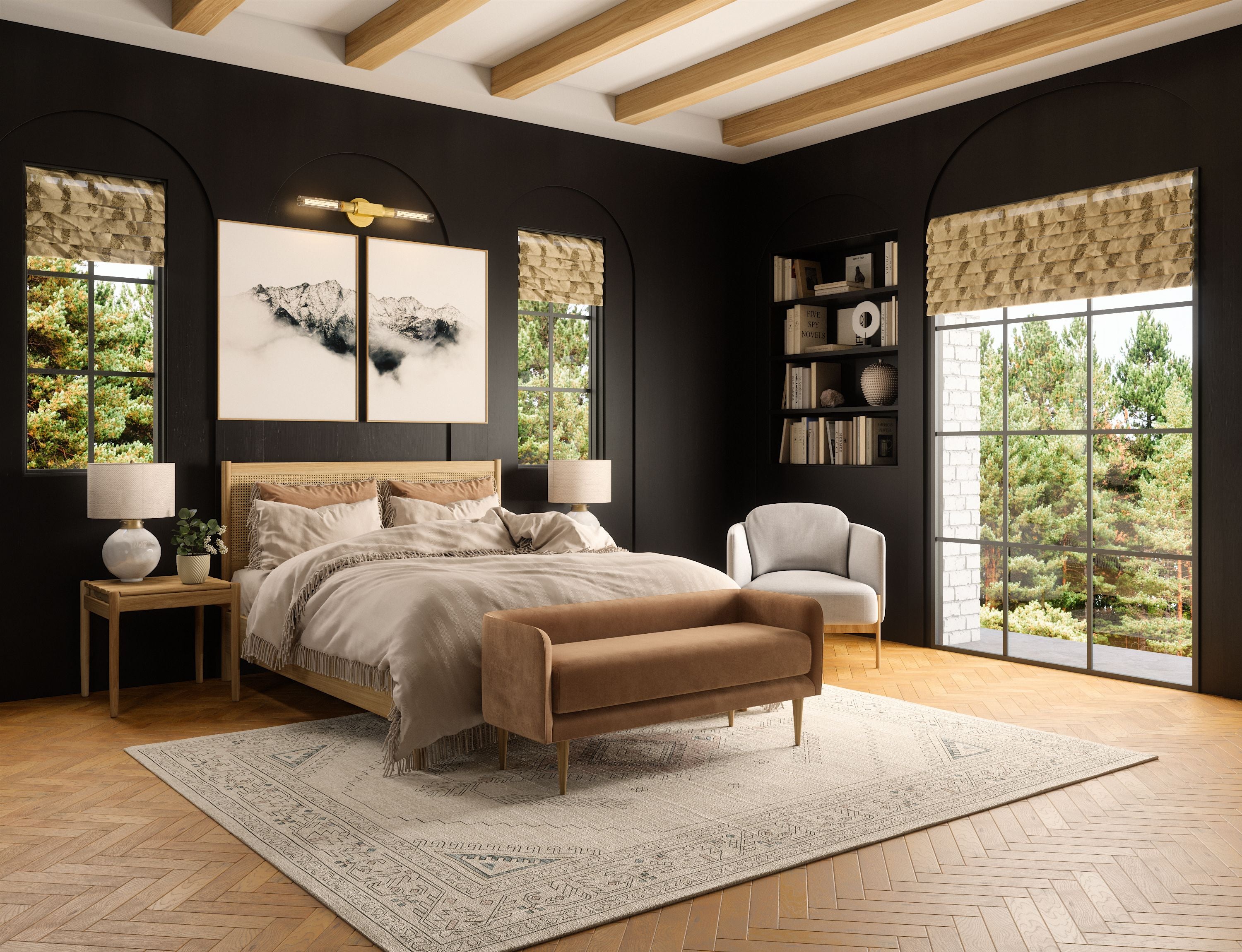 When selecting the appropriate rug size, direct your attention to the dimensions of your bed. The prevailing approach involves positioning a spacious area rug beneath the bed, serving as the centerpiece of the room. Conversely, a smaller rug positioned adjacent to the bed serves as a complementary accent while providing a cozy landing spot for your feet.