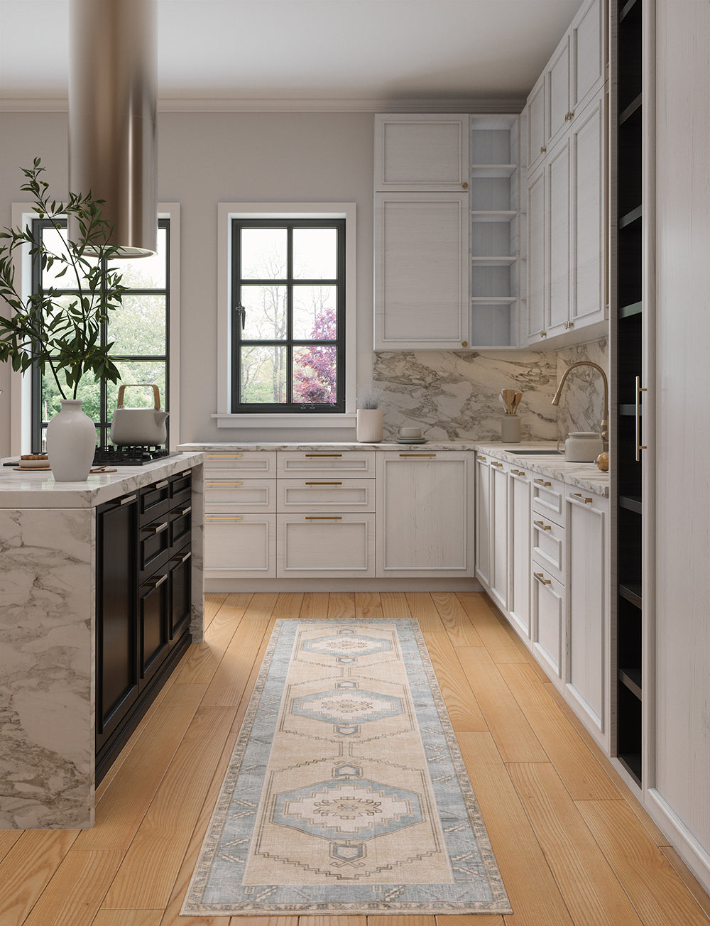 Barbara is a beautiful centerpiece with a Persian design and a range of beautiful, pastel colors such as a light blue and beige. It effortlessly pairs with many different rug pads, making it a versatile choice for any room .