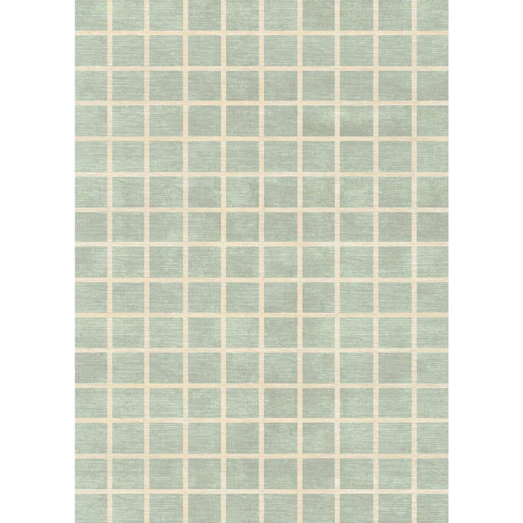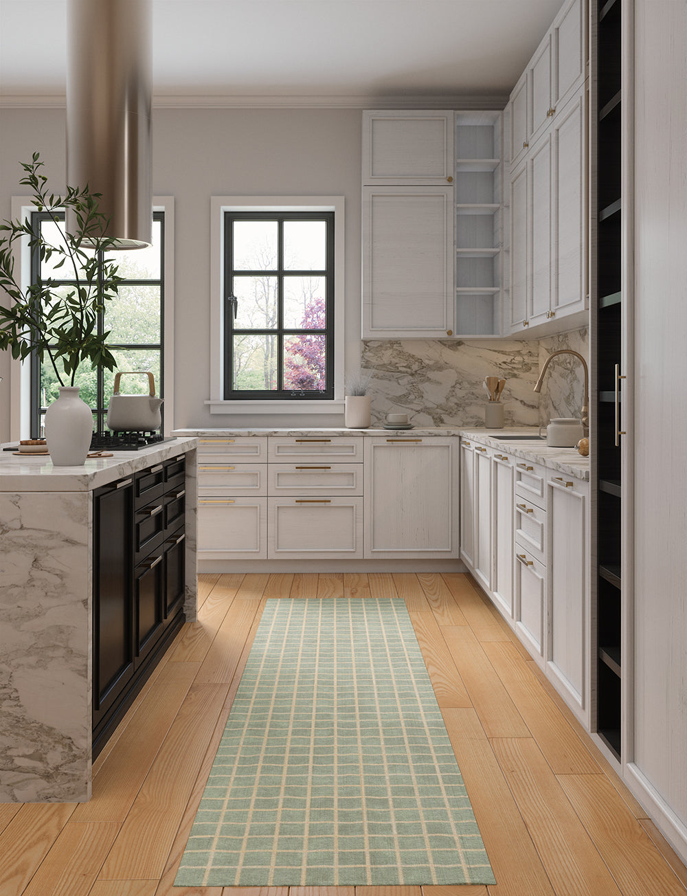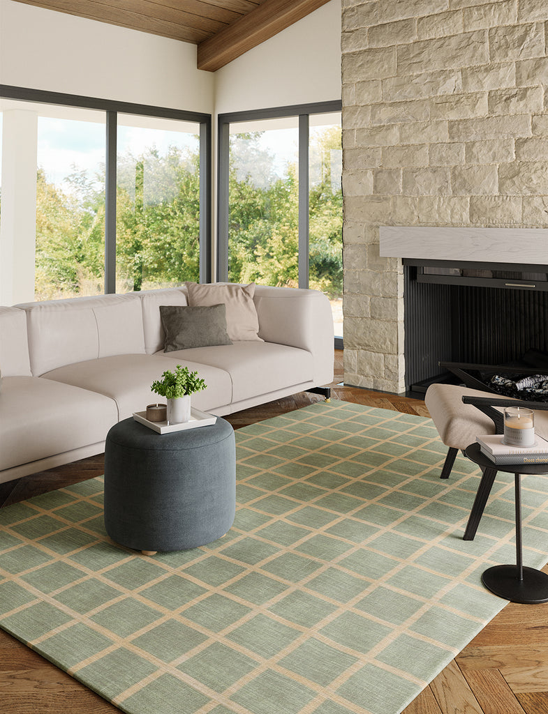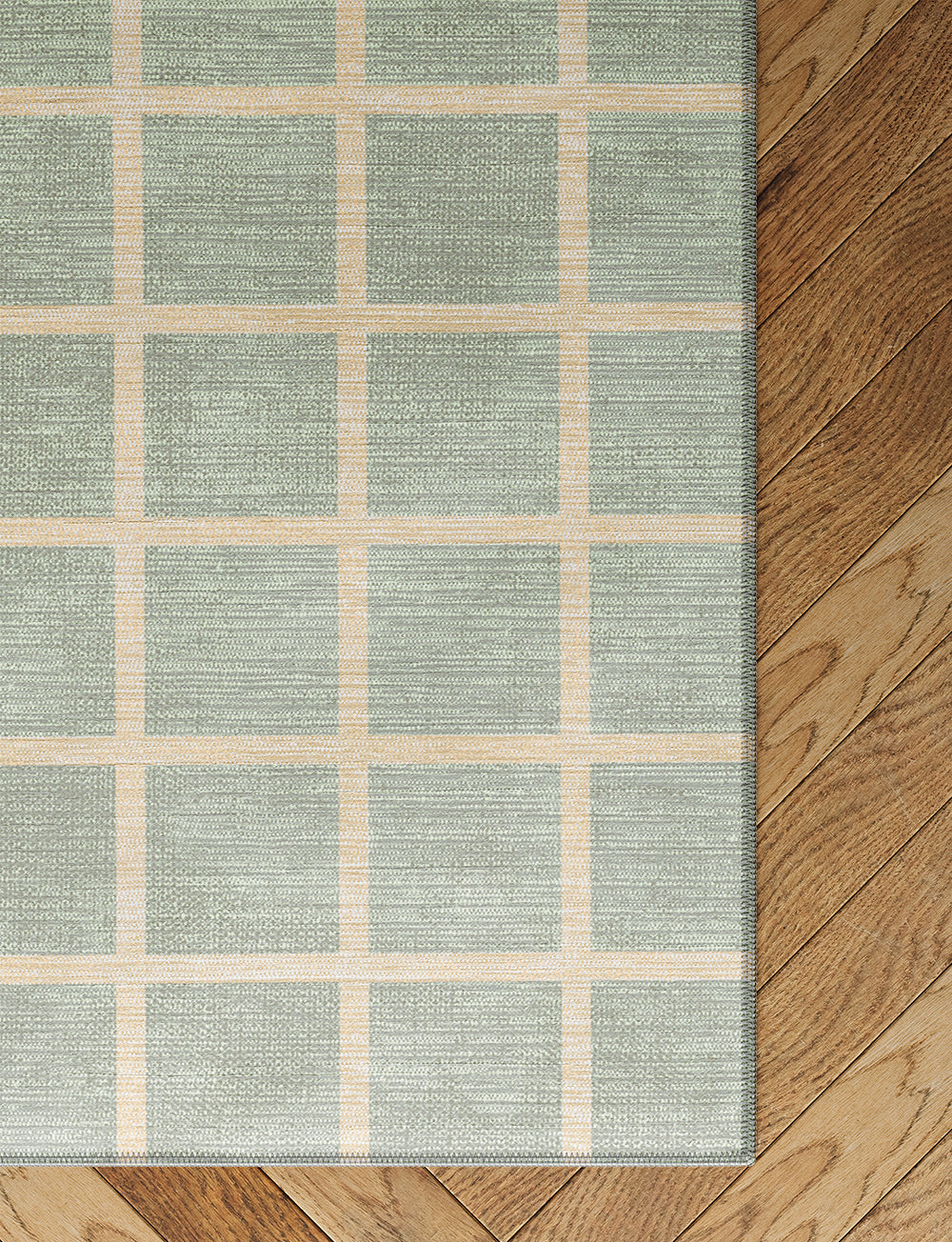 Caper is a beautiful centerpiece with a modern checkered design with mint green and beige colors. It effortlessly pairs with many different rug pads, making it a versatile choice for any room .