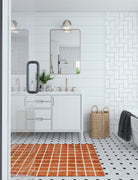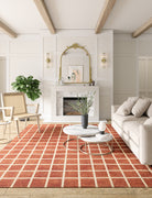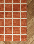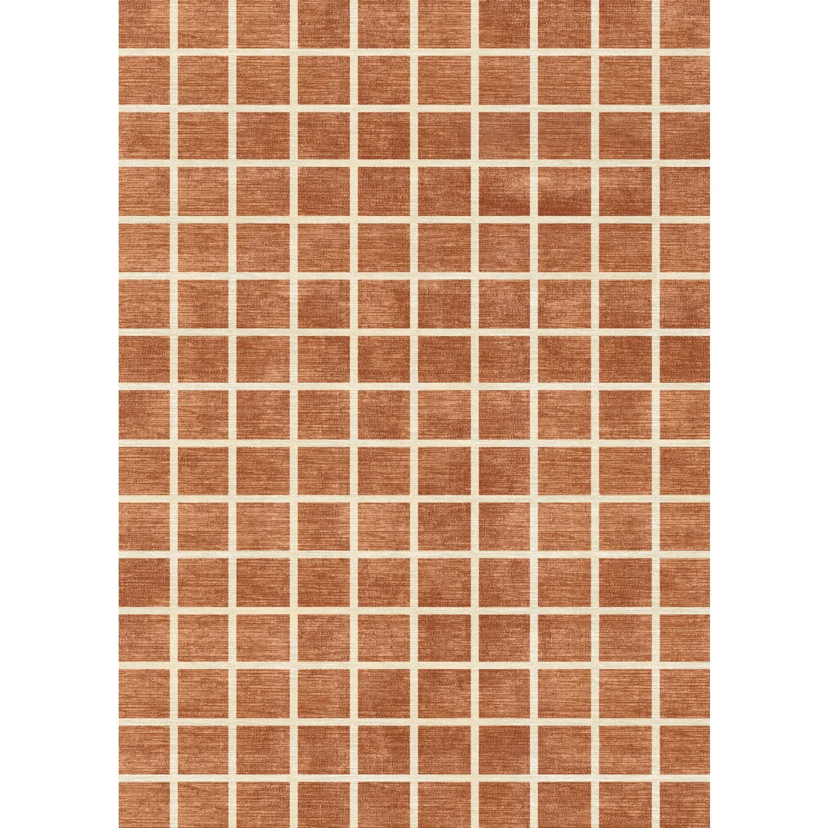 Caper is a beautiful centerpiece with a modern checkered design with orange and beige colors. It effortlessly pairs with many different rug pads, making it a versatile choice for any room .