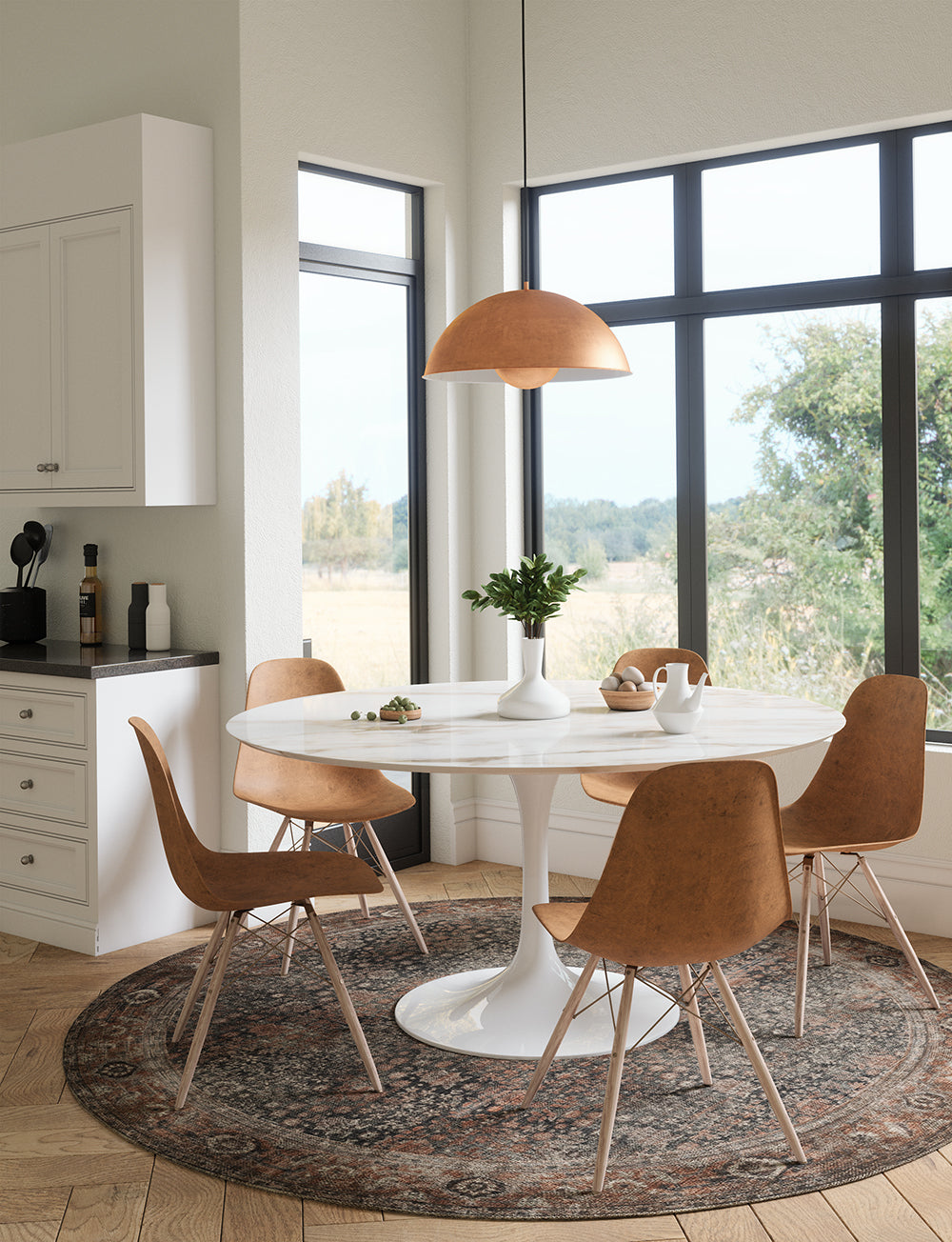 When looking for a living room rug, consider your furniture and take note of the various layout options. If it’s an open floor plan, the rug should help define the space and improve the acoustics.