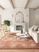 Kazna is a beautiful centerpiece with a boho design with a simple color mix of orange, teal, light coral and beige. It effortlessly pairs with many different rug pads, making it a versatile choice for any room .