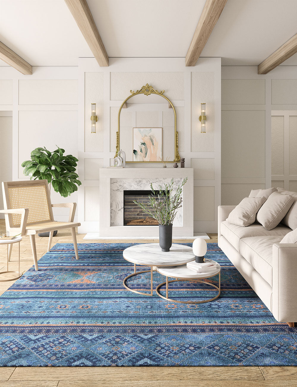 When looking for a living room rug, consider your furniture and take note of the various layout options. If it’s an open floor plan, the rug should help define the space and improve the acoustics.