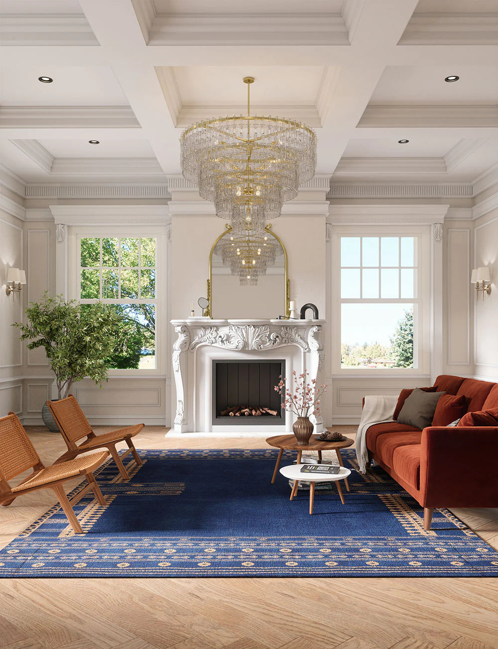 When looking for a living room rug, consider your furniture and take note of the various layout options. If it’s an open floor plan, the rug should help define the space and improve the acoustics.