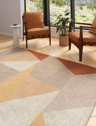 Mizza is a beautiful centerpiece with a Modern Geometric design with a multicolor mix of beige, yellow, beige and orange. It effortlessly pairs with many different rug pads, making it a versatile choice for any room .
