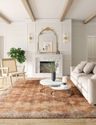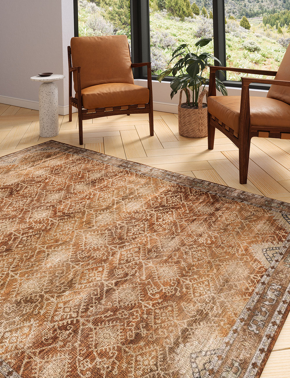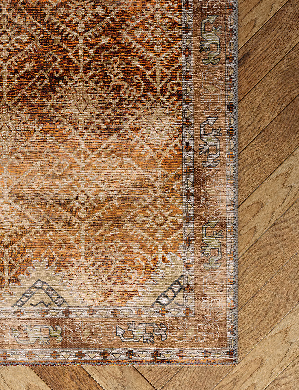 Wilma is a beautiful centerpiece with a Persian design with a simple color mix of orange and sandy beige. It effortlessly pairs with many different rug pads, making it a versatile choice for any room .