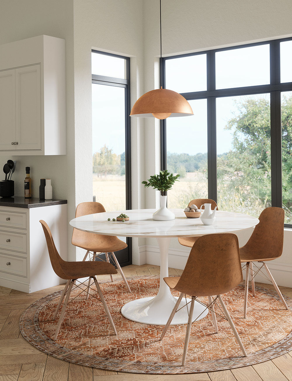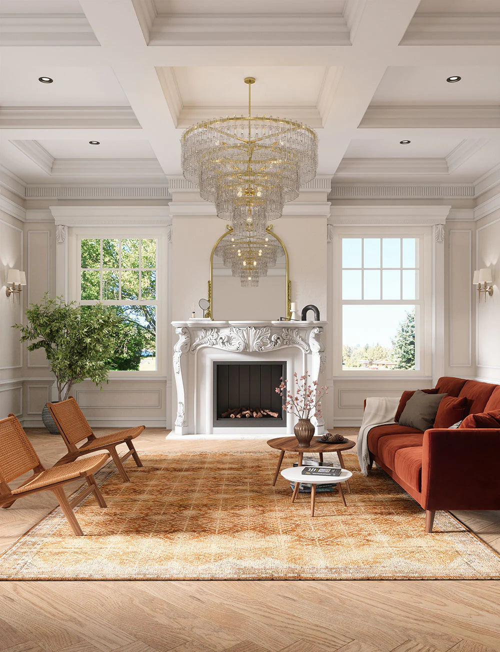 When looking for a living room rug, consider your furniture and take note of the various layout options. If it’s an open floor plan, the rug should help define the space and improve the acoustics.